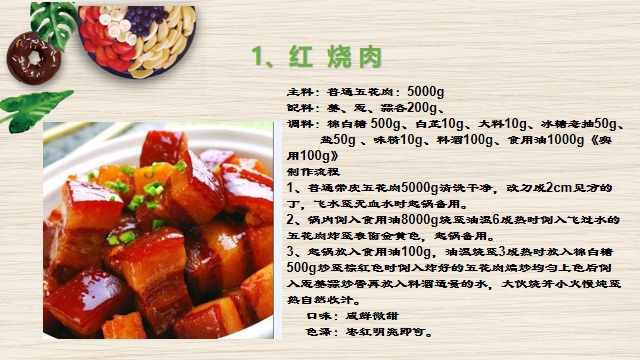 客林餐飲的餐品包含各大菜系,并且有專業(yè)的制作流程和量化的制作工藝,下面是本公司招牌葷菜制作標(biāo)準(zhǔn)!